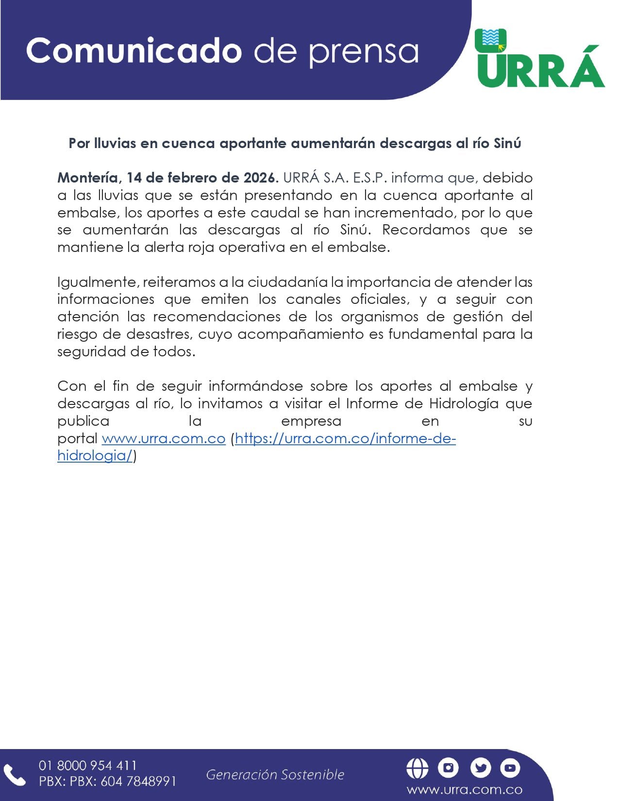 “Debido a las lluvias que se están presentando en la cuenca aportante al embalse, los aportes a este caudal se han incrementado, por lo que se aumentarán las descargas al río Sinú. Recordamos que se mantiene la alerta roja operativa en el embalse”, informó la Central.