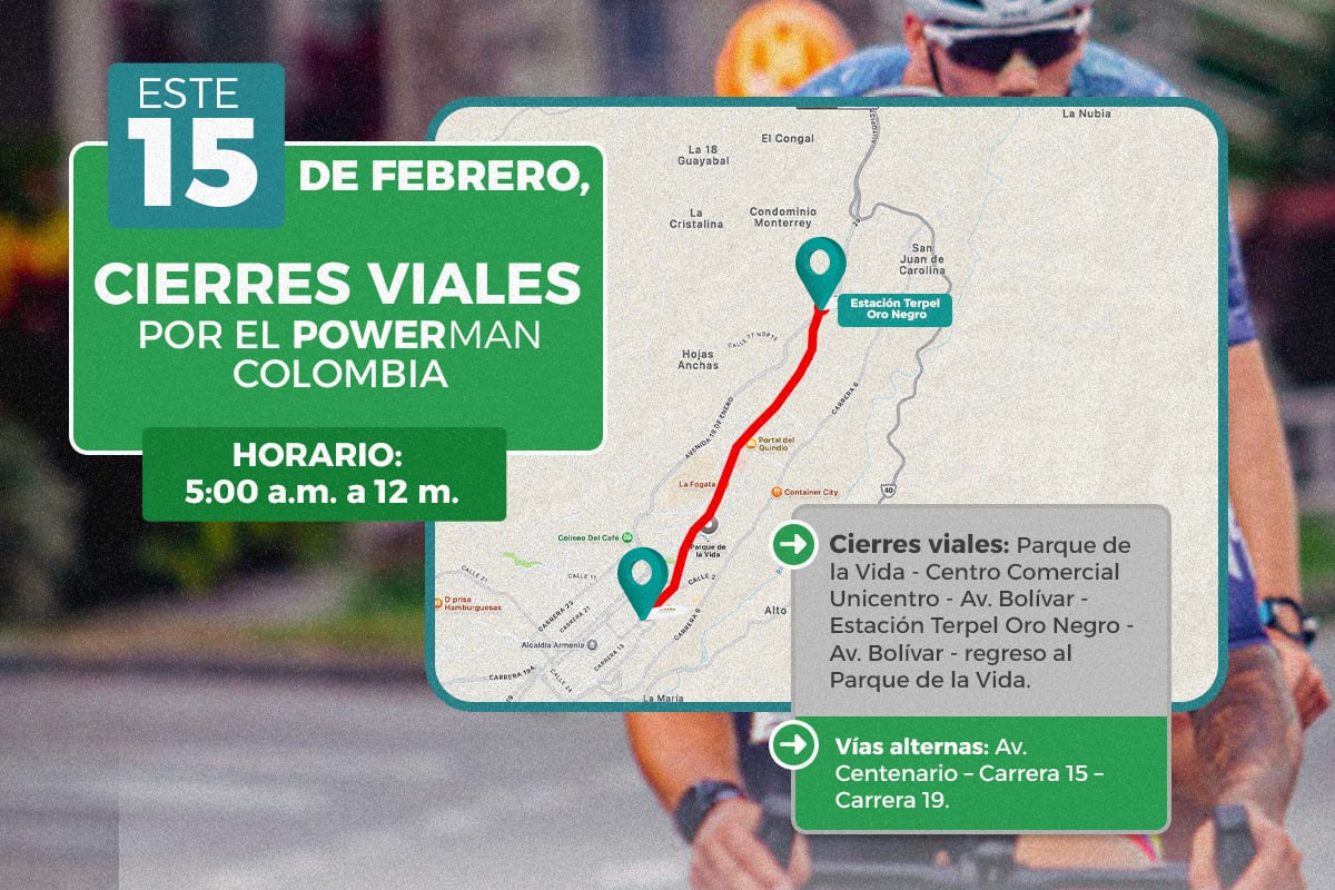 El secretario de tránsito y transporte de Armenia, Daniel Jaime Castaño indicó que “el domingo 15 de febrero se va a tener el desarrollo de la competencia Powerman donde se van a tener unos cierres viales en toda la avenida Bolívar, la carrera 14 desde la calle 9 y hasta el sector de Oro Negro, en ambos sentidos va a estar cerrada, los cierres se inician a las 5 de la mañana y estará cerrado o la autorización está hasta el mediodía y esperamos pues de que si se termina antes esta competencia se vayan habilitando las vías.