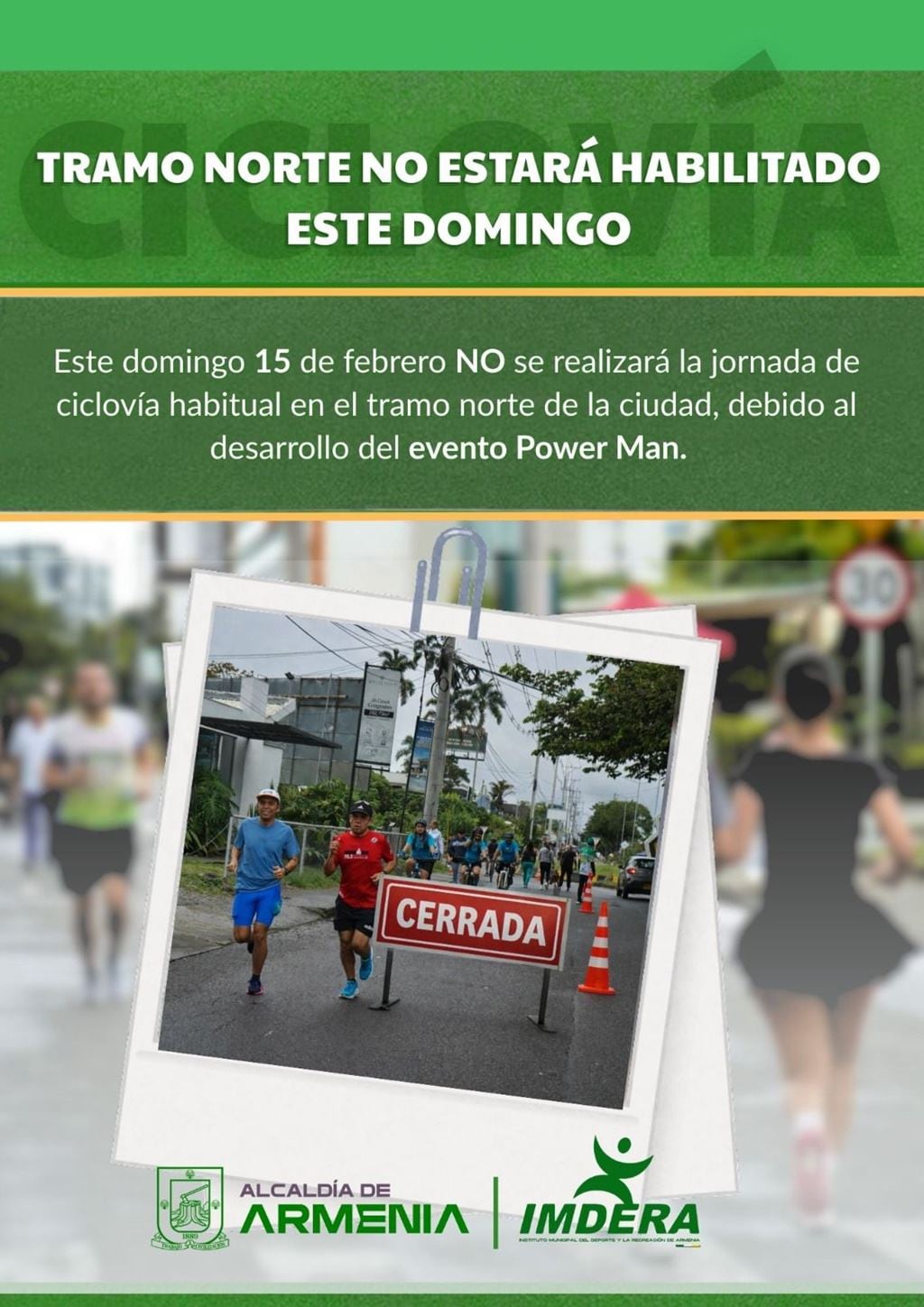 El Instituto Municipal del Deporte y la Recreación de Armenia, Imdera informa a la comunidad que este domingo 15 de febrero no se habilitará el tramo norte de la ciclovía, debido a la realización del World Series Power Man 2026, que demandará un amplio despliegue logístico y cierres viales en ese sector de la ciudad.