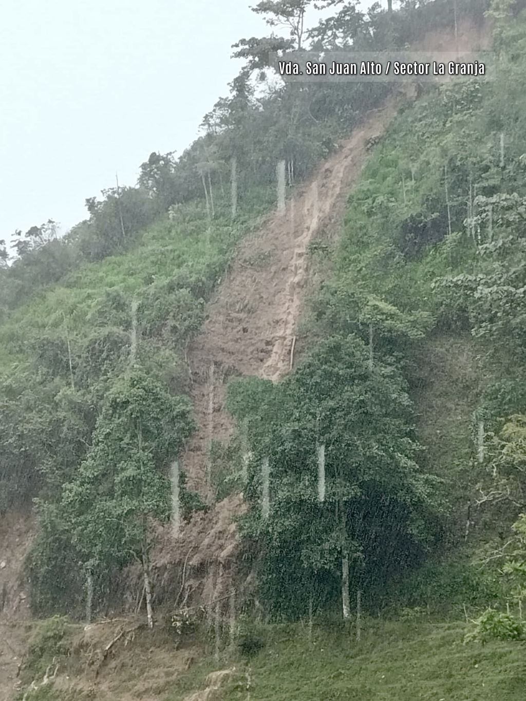 Vereda San Juan, Ramal La Bengala: creciente súbita con cierre de vía y deslizamiento por remoción en masa. Fonda San Juan Medio: deslizamiento con cierre de vía. La Granja (San Juan Alto): deslizamiento por remoción en masa. Finca La Secreta: deslizamiento en la parte posterior de una vivienda, con filtración e ingreso de agua. Finca de Bernardo Torres: deslizamiento por remoción en masa.