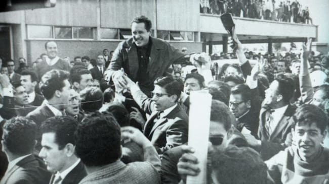Camilo Torres Restrepo siendo alzado por una multitud durante un evento público.