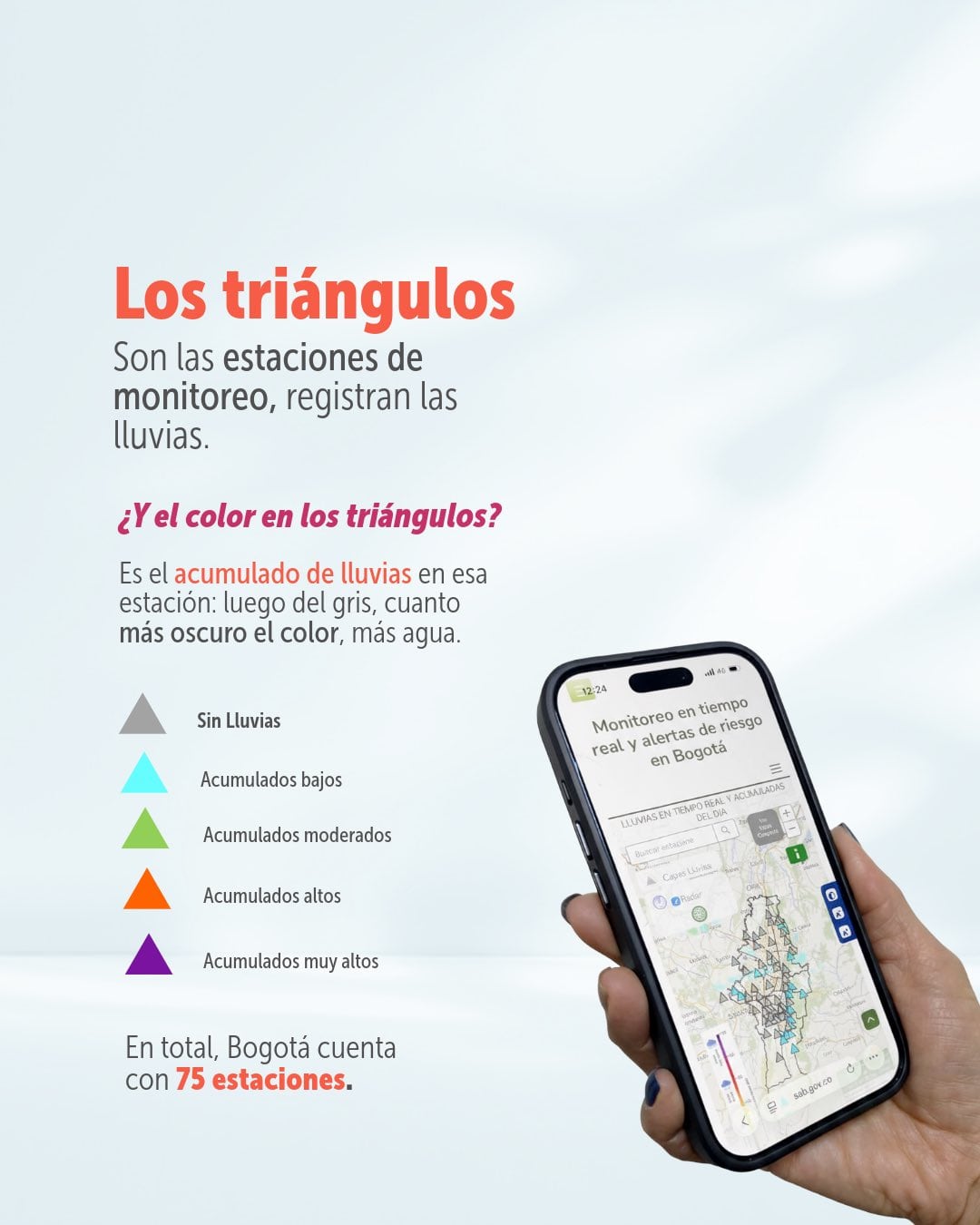 Al ingresar a la herramienta, las personas podrán identificar en qué localidades hay lluvias a través de triángulos: