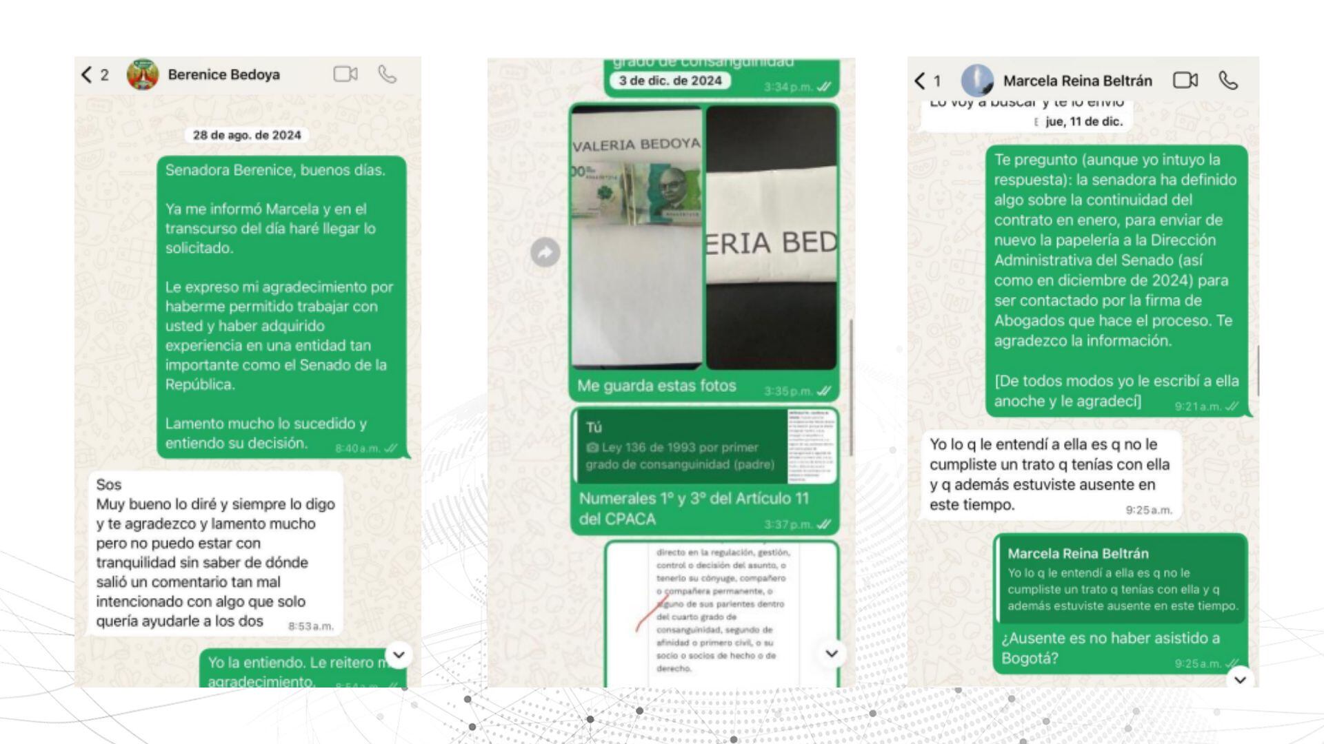 Caracol Radio se comunicó con la senadora Berenice Bedoya, y aseguró que la salida de Mesa realmente obedeció a que, presuntamente, estaba pidiendo favores a su nombre sin autorización.