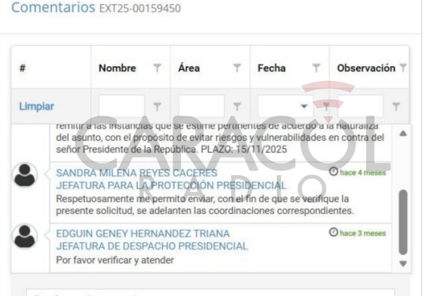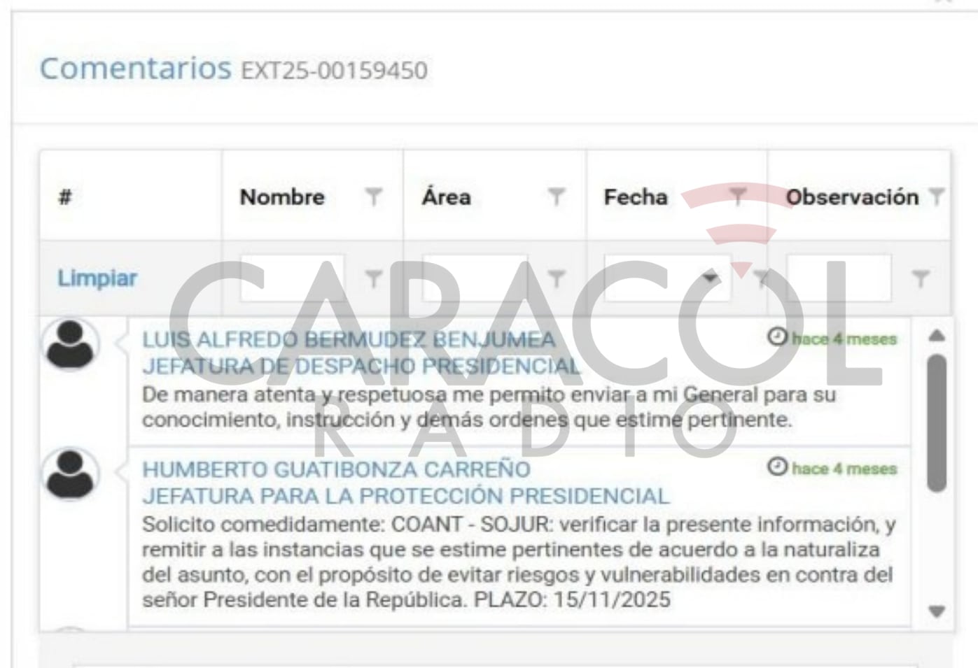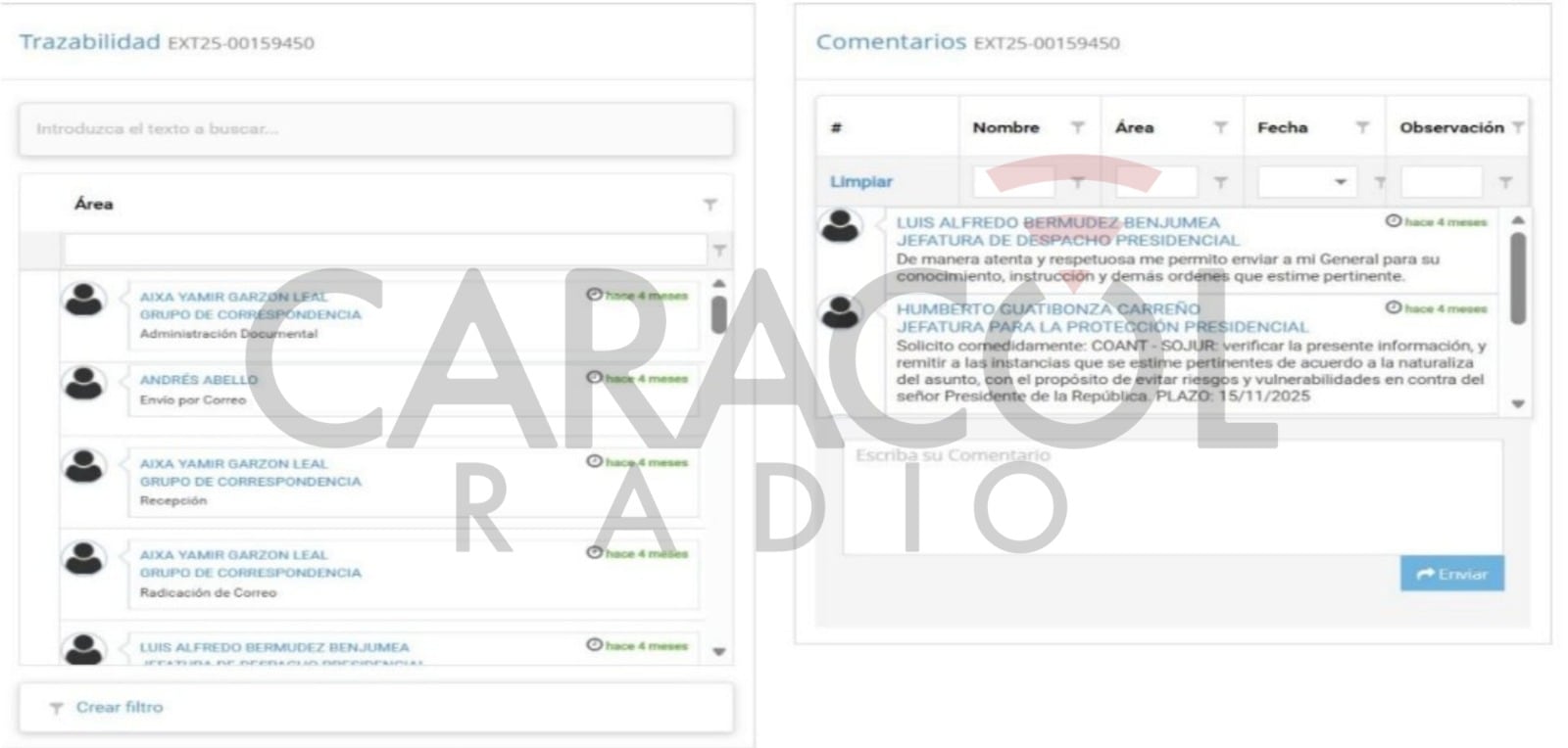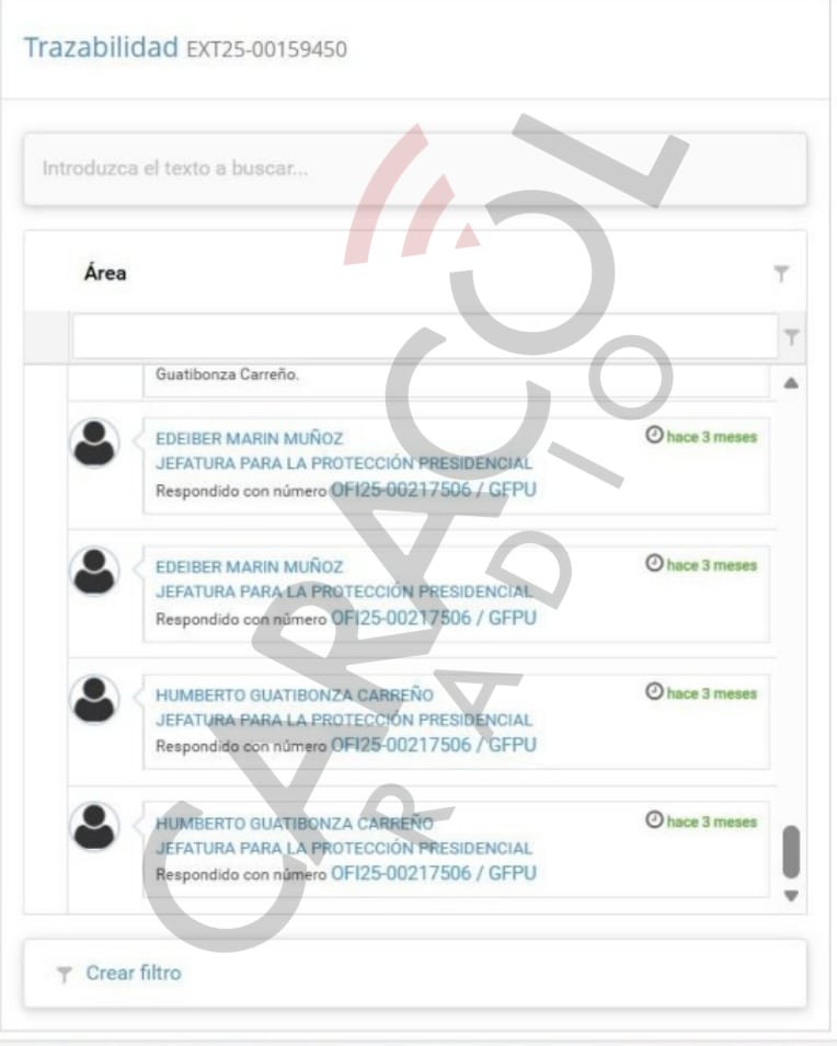Los registros de trazabilidad del DAPRE dan cuenta del camino que siguió la denuncia sin pruebas y sin datos que hizo un supuesto Andrés Abello a través del Portal PACO: el texto llega al grupo de correspondencia de la Presidencia de la República y de ahí se envió a la jefatura del despacho del presidente. Luego, desde esa jefatura, el mensaje se envió al general (r) Humberto Guatibonza, jefe de protección del presidente quien determinó que la información allí contenida debía ser verificada antes del 15 de noviembre de 2025 para tomar las medidas que correspondan de ser necesario.