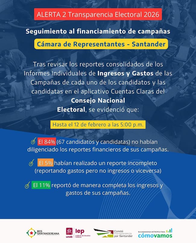 El seguimiento fue divulgado por un grupo de organizaciones de la sociedad civil integradas por la Red Santandereana por la Transparencia, el Instituto de Estudios Políticos UNAB, el Comité de Transparencia por Santander y Bucaramanga Metropolitana Cómo Vamos, que buscan promover la rendición de cuentas y el acceso a la información durante el proceso electoral.