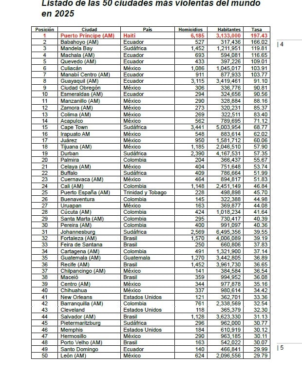“En 2025 salieron del ranking nueve ciudades: las brasileñas Caruaru y Manaus; las estadounidenses Baltimore y Detroit; la capital de Jamaica, Kingston y las mexicanas Benito Juárez (Cancún), Morelia, Tapachula y Zacatecas. En su lugar ingresaron: Babahoyo, Quevedo, Esmeraldas y Santo Domingo de Ecuador; Buenaventura y Pereira de Colombia; Hermosillo de México; Pietermaritzburg de Sudáfrica y Guatemala, del país del mismo nombre”.