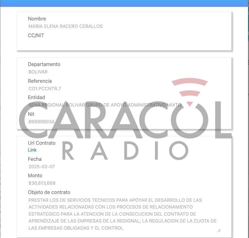 5. La tía del representante a la Cámara, María Helena Racero Ceballos, recibió contrato por más de 30 millones con el Sena Regional de Bolívar.
