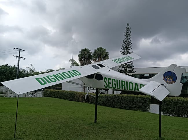 Dias de cielo nublado en Armenia, avioneta decorativa en el comando de la Policía en el Quindío. Foto: Adrián Trejos