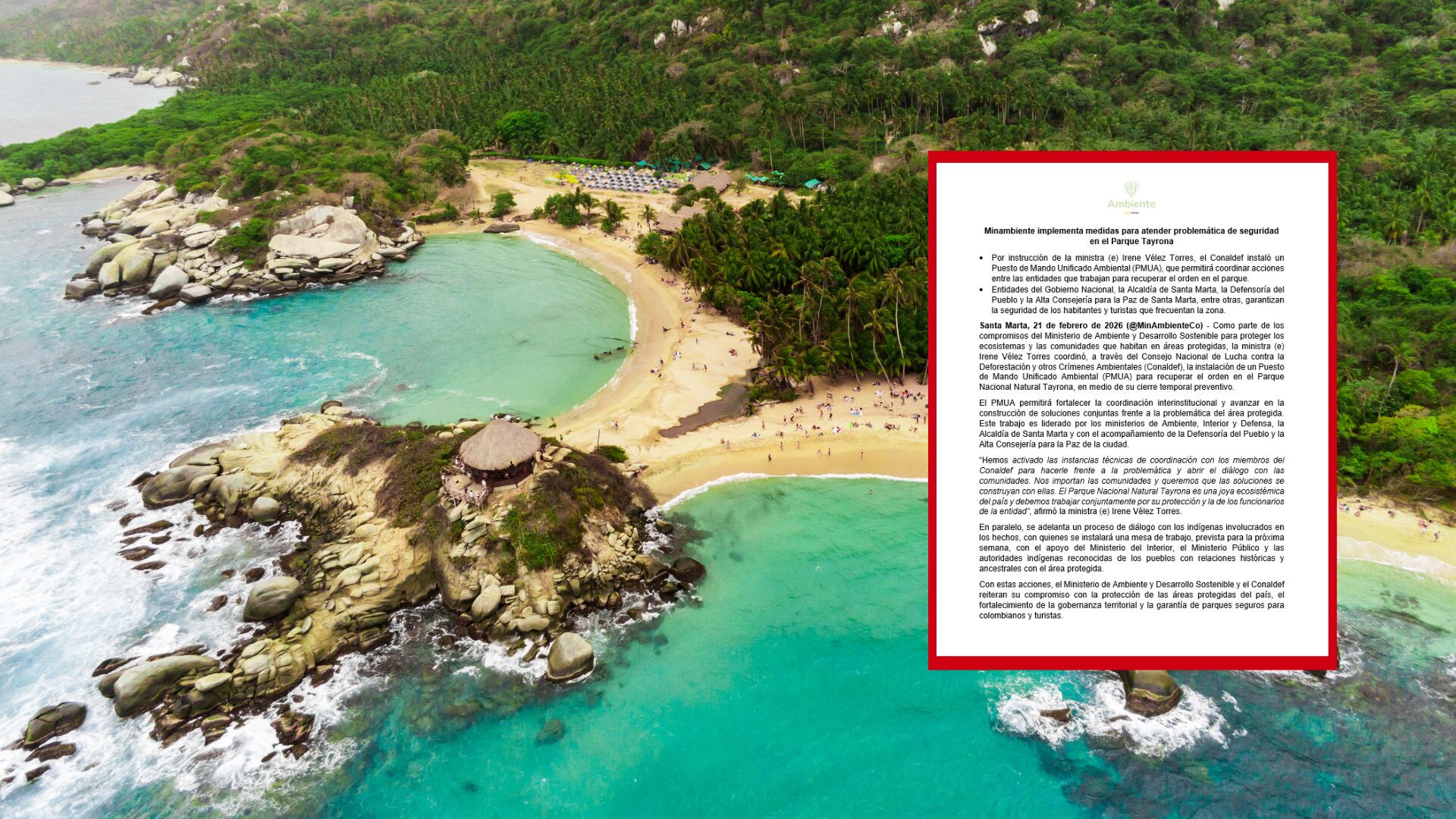 El Ministerio de Ambiente activó un Puesto de Mando Unificado Ambiental (PMUA) en el Parque Nacional Natural Tayrona, luego de su cierre temporal por amenazas, bloqueos y alteraciones del orden público que pusieron en riesgo a funcionarios y visitantes.