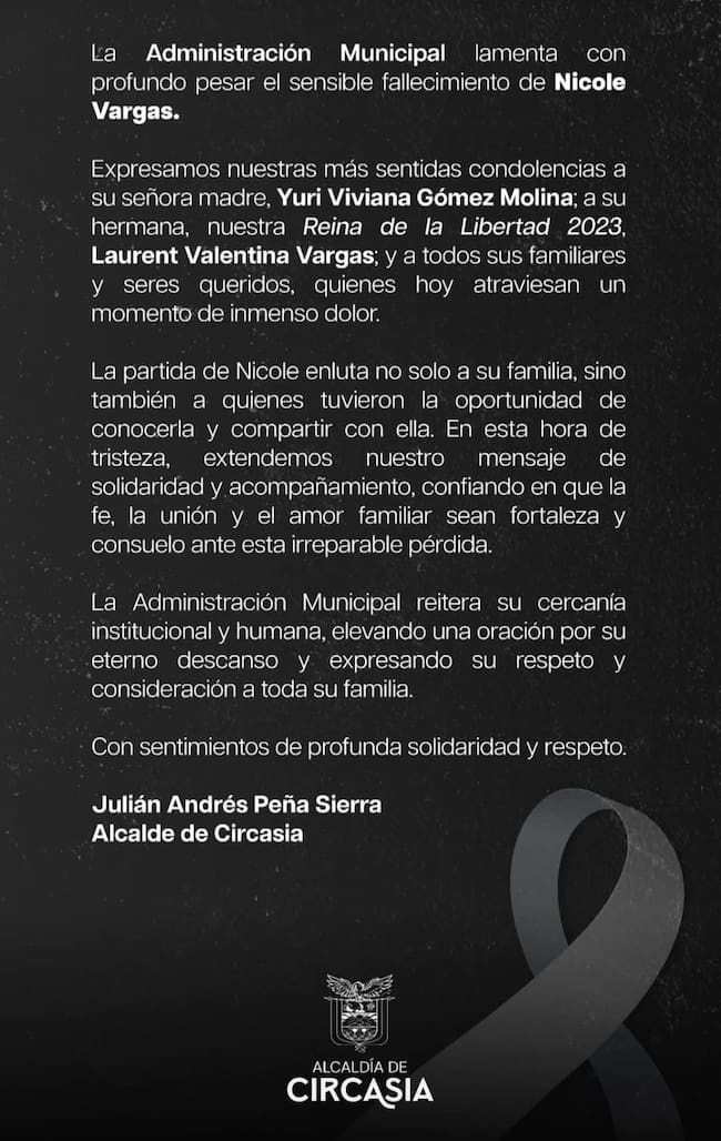 A propósito, el alcalde del municipio de Circasia, Julián Andrés Peña lamentó el fallecimiento de Nicole y envío un mensaje de solidaridad a sus familiares en medio del inmenso dolor.