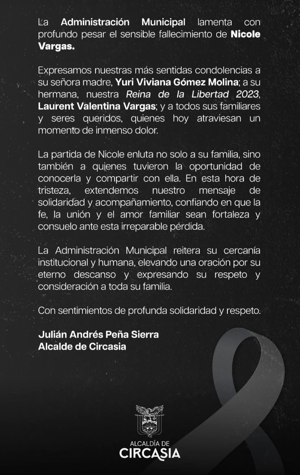 A propósito, el alcalde del municipio de Circasia, Julián Andrés Peña lamentó el fallecimiento de Nicole y envío un mensaje de solidaridad a sus familiares en medio del inmenso dolor.