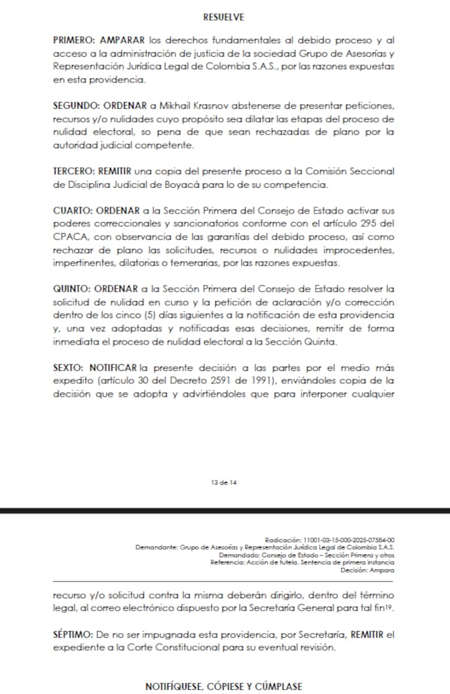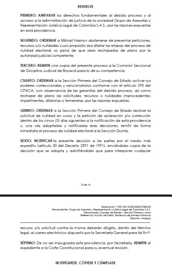 Como consecuencia, el fallo ordenó a Krasnov abstenerse de presentar recursos o nulidades con fines dilatorios, bajo advertencia de rechazo inmediato, y dispuso remitir copias a la Comisión Seccional de Disciplina Judicial de Boyacá para evaluar la conducta profesional de la apoderada. Además, ordenó a la Sección Primera resolver en un plazo de cinco días las solicitudes pendientes y remitir de inmediato el expediente a la Sección Quinta para que continúe el trámite de segunda instancia. De no ser impugnada, la decisión será enviada a la Corte Constitucional para su eventual revisión, en un caso que reabre el debate sobre los límites entre el derecho de defensa y el abuso de las herramientas procesales en controversias electorales.