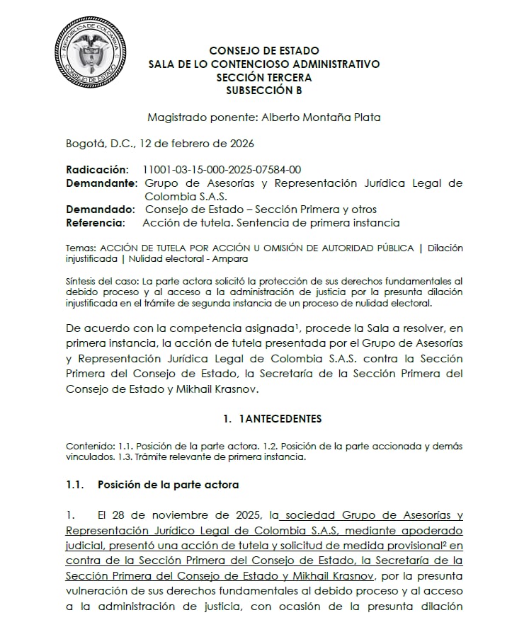 El Consejo de Estado amparó los derechos fundamentales al debido proceso y al acceso a la administración de justicia de la sociedad Grupo de Asesorías y Representación Jurídica Legal de Colombia S.A.S., al concluir que el trámite de segunda instancia de la nulidad electoral contra el alcalde de Tunja fue objeto de una dilación injustificada.