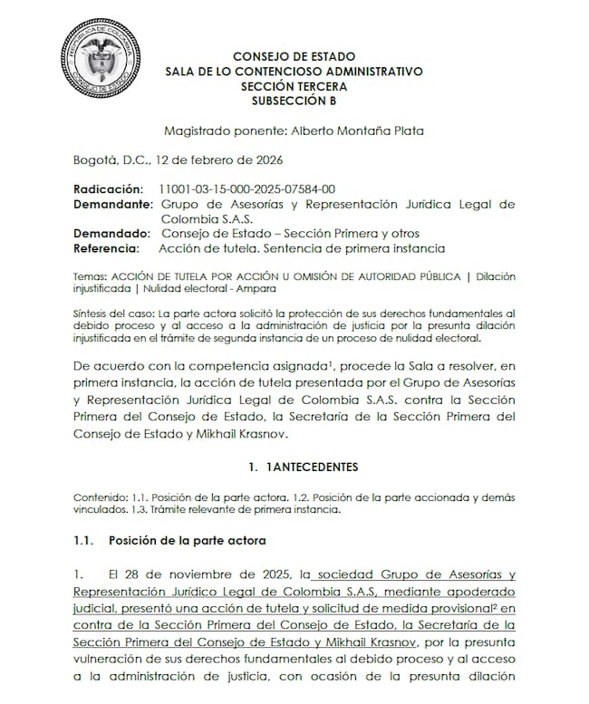 En una sentencia de primera instancia, la Sección Tercera —Subsección B— determinó que, desde la admisión de las apelaciones contra el fallo que anuló la elección, han transcurrido más de ocho meses sin que el expediente avance hacia decisión definitiva, en medio de una cadena de recusaciones, nulidades y solicitudes de aclaración que prolongaron el proceso.