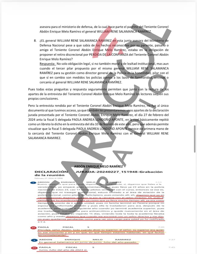 El primero de ellos es el teniente coronel Abdón Enrique Melo Ramírez. “Este oficial, refiriéndonos al teniente coronel Abdón Enrique Melo Ramírez es de los oficiales más cercanos y que gozan de especial aprecio del señor General WILLIAM RENE SALAMANCA RAMÍREZ, director general de la Policía Nacional, tanto así que son parientes por consanguinidad materna (RAMIREZ), son paisanos, amigos, tal como de manera literal el teniente coronel Abdón Enrique Melo Ramírez lo manifestó en repetidas ocasiones”, dice el informe.