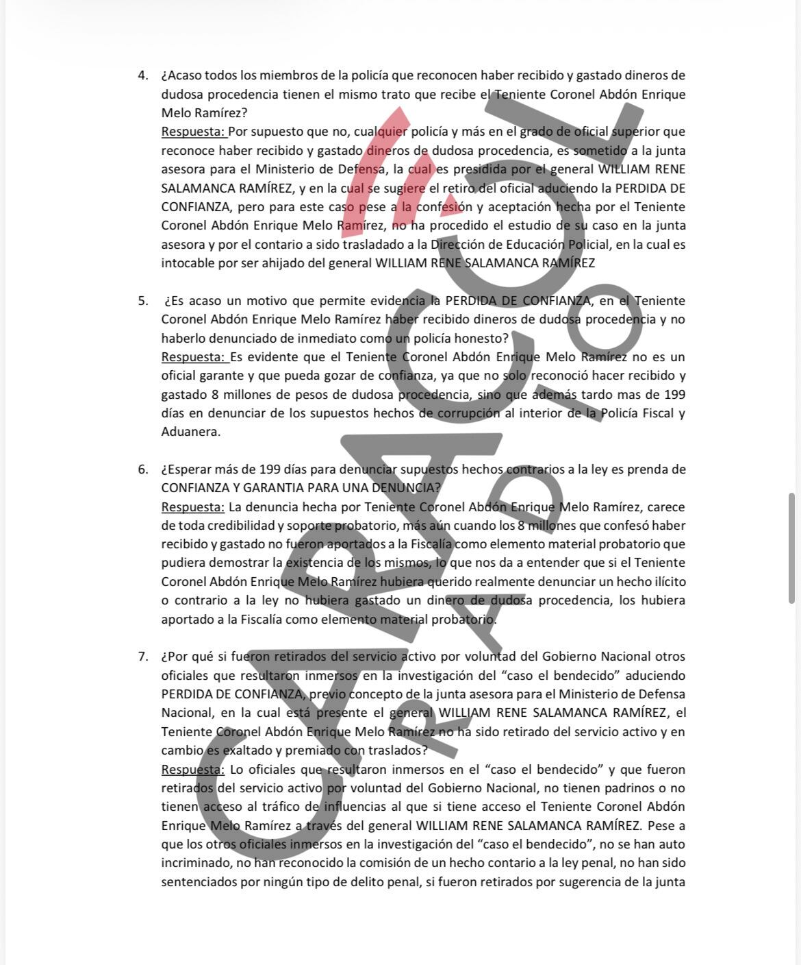 El primero de ellos es el teniente coronel Abdón Enrique Melo Ramírez. “Este oficial, refiriéndonos al teniente coronel Abdón Enrique Melo Ramírez es de los oficiales más cercanos y que gozan de especial aprecio del señor General WILLIAM RENE SALAMANCA RAMÍREZ, director general de la Policía Nacional, tanto así que son parientes por consanguinidad materna (RAMIREZ), son paisanos, amigos, tal como de manera literal el teniente coronel Abdón Enrique Melo Ramírez lo manifestó en repetidas ocasiones”, dice el informe.