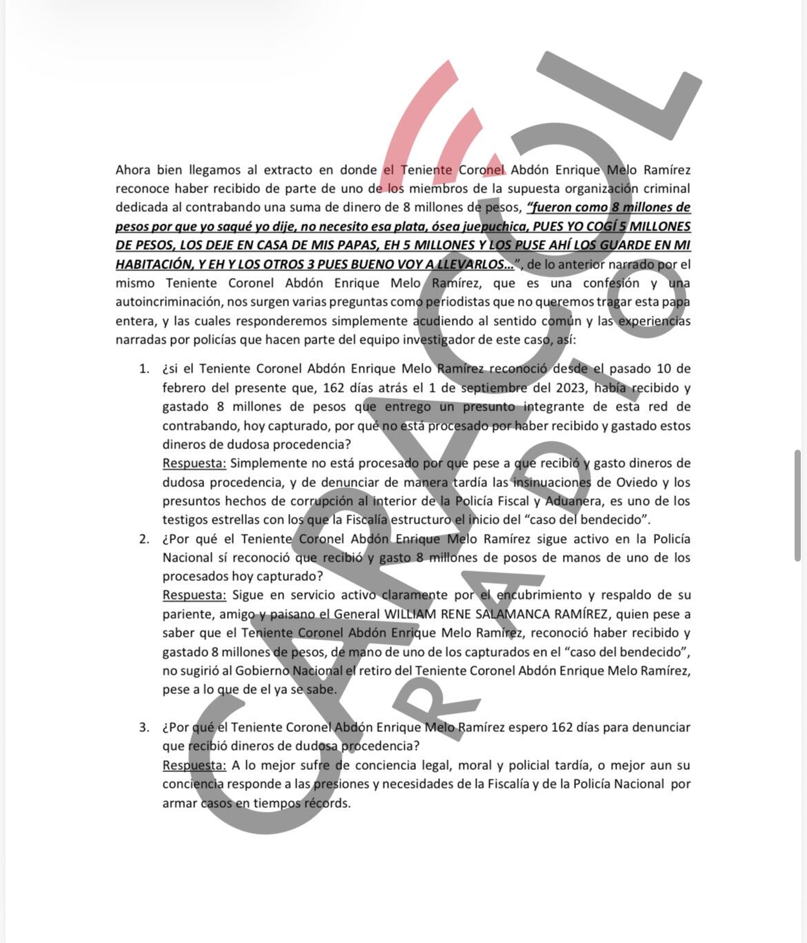 En otro punto señala: “sigue en servicio activo (Melo) claramente por el encubrimiento y respaldo de su pariente, amigo y paisano el General WILLIAM RENE SALAMANCA RAMÍREZ, quien pese a saber que el teniente coronel Abdón Enrique Melo Ramírez, reconoció haber recibido y gastado 8 millones de pesos, de mano de uno de los capturados en el “caso del bendecido”, no sugirió al Gobierno Nacional el retiro del teniente coronel Abdón Enrique Melo Ramírez, pese a lo que de él ya se sabe”, agrega.