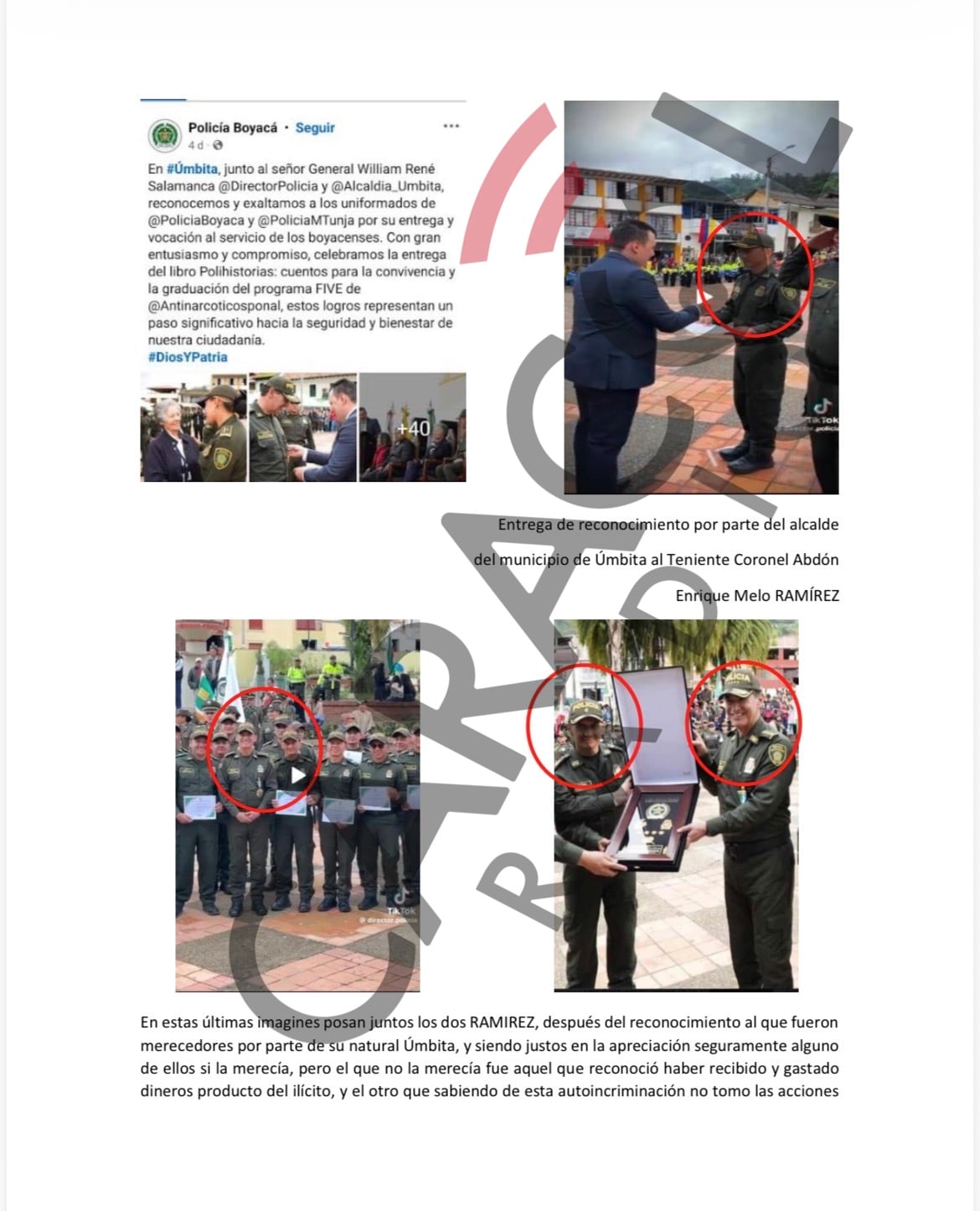 Además, hay fotografías de una condecoración que recibió Melo el mismo año del escándalo, por parte del alcalde de Úmbita, Boyacá. Dice el informe que “el general WILLIAM RENE SALAMANCA RAMIREZ indujo al error al señor alcalde quien, basado en el principio de buena fe y seguramente a la revisión y aprobación de su paisano el general WILLIAM RENE SALAMANCA RAMIREZ, reconoció y condecoró a un grupo de policías oriundos de esta municipalidad, entre los cuales se destaca con descaro absoluto el Teniente Coronel Abdón Enrique Melo Ramírez, quien una vez mas pudo hacer alarde de su cercanía y amistad profusa con el general WILLIAM RENE SALAMANCA RAMIREZ y demostrar que el apellido RAMIREZ puede con todo”.