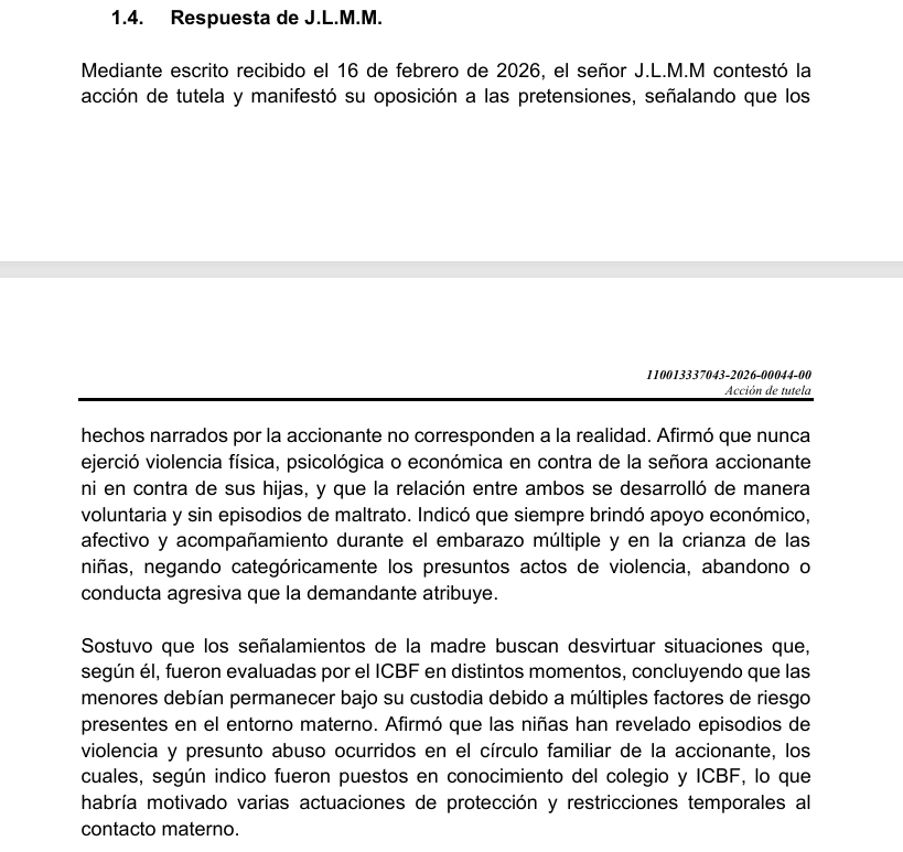 El padre de las niñas, en respuesta judicial, ha negado haber ejercido violencia física, psicológica o económica y sostiene que la relación fue voluntaria y que siempre brindó apoyo a sus hijas. Esa versión hace parte del expediente y deberá ser valorada dentro de los procesos en curso.