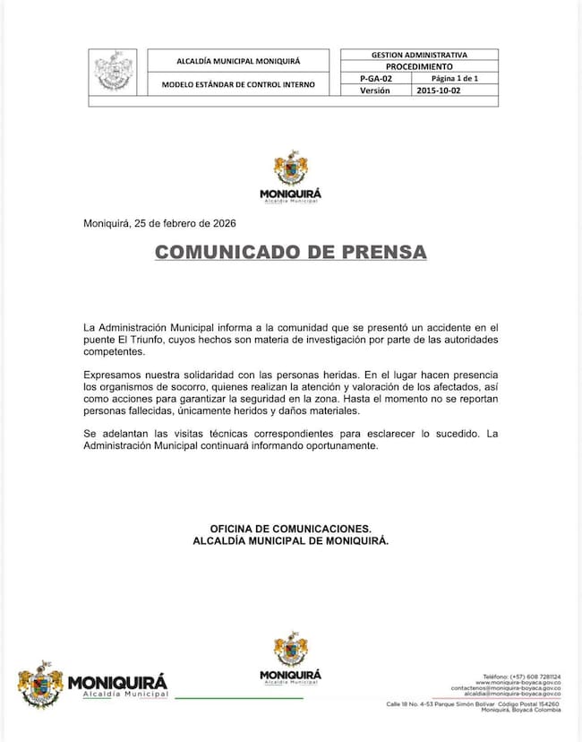 La obra del puente Triunfo hacía parte de la estrategia departamental ‘Así va la obra’, impulsada por el Gobierno de Boyacá para el seguimiento de proyectos de infraestructura. Esta intervención buscaba restablecer la conectividad de un corredor estratégico para la economía, el turismo y el desarrollo agroindustrial de la provincia Ricaurte, objetivo que ahora queda en incertidumbre tras el colapso de la estructura.