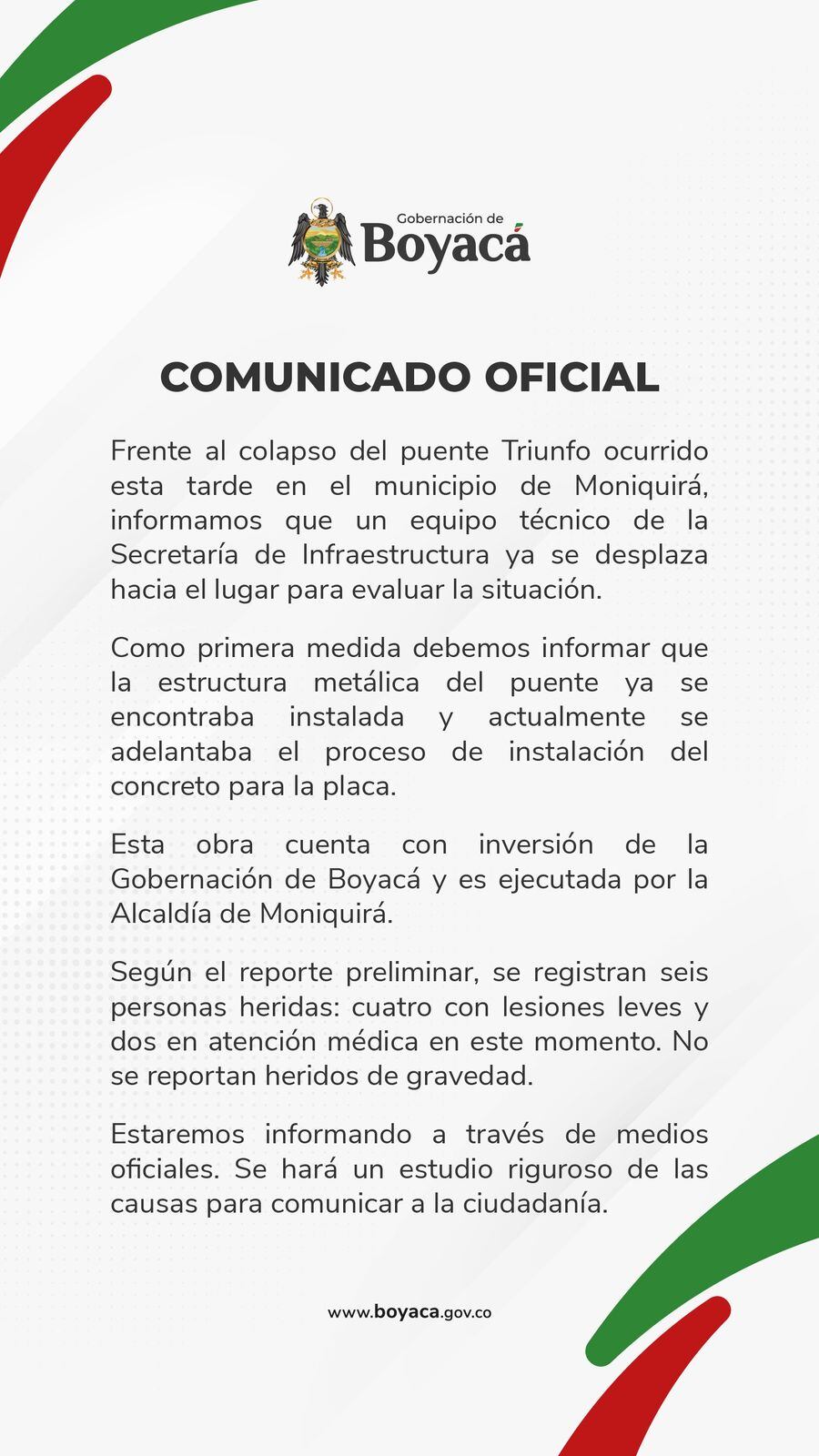 Sobre este incidente, la Gobernación de Boyacá se pronunció a través de un comunicado y confirmó que seis personas resultaron heridas: