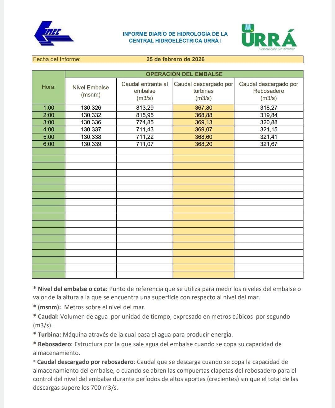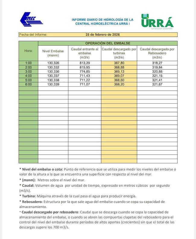 Reportes de Urrá durante este 25 de febrero de 2026.