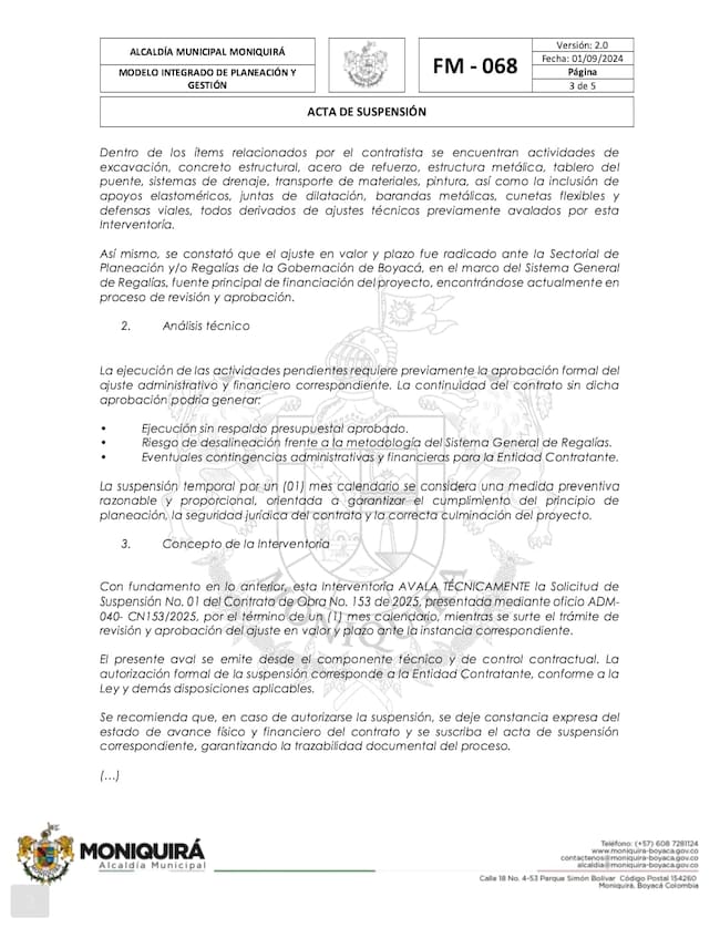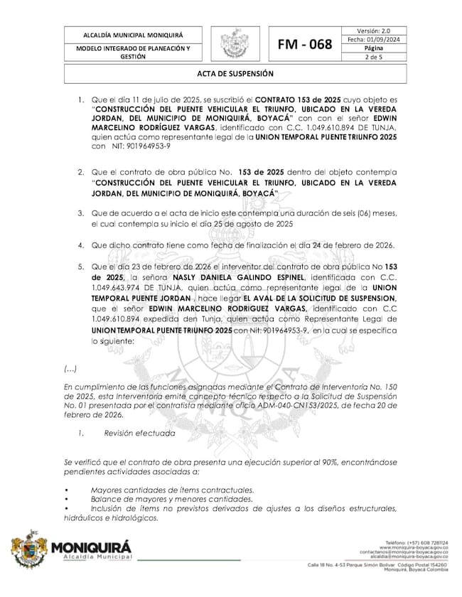 Suspender el plazo de ejecución del contrato de obra No 153 de 2025 cuyo objeto es “CONSTRUCCIÓNDEL PUENTE VEHICULAREL TRIUNFO, UBICADOEN LA VEREDAJORDAN,DEL MUNICIPIO DE MONIQUIRÁ, BOYACÁ” a partir de la fecha de suscripción del presente documento por un término de un (01) mes.