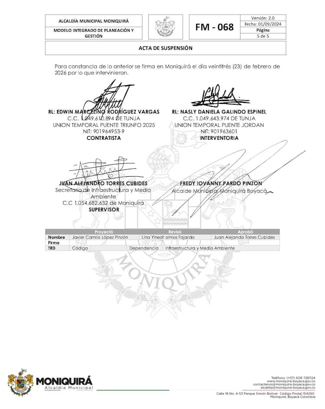Según el acta de suspensión de la obra, la cual se suscribió el martes 23 de febrero de 2026, se acordó: