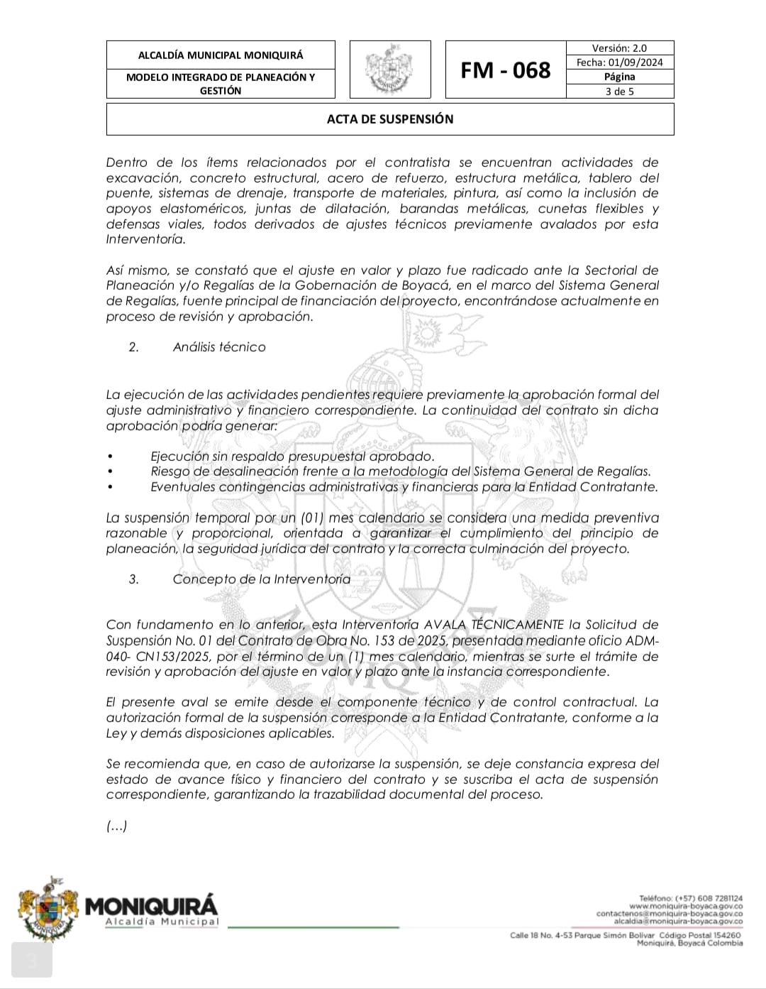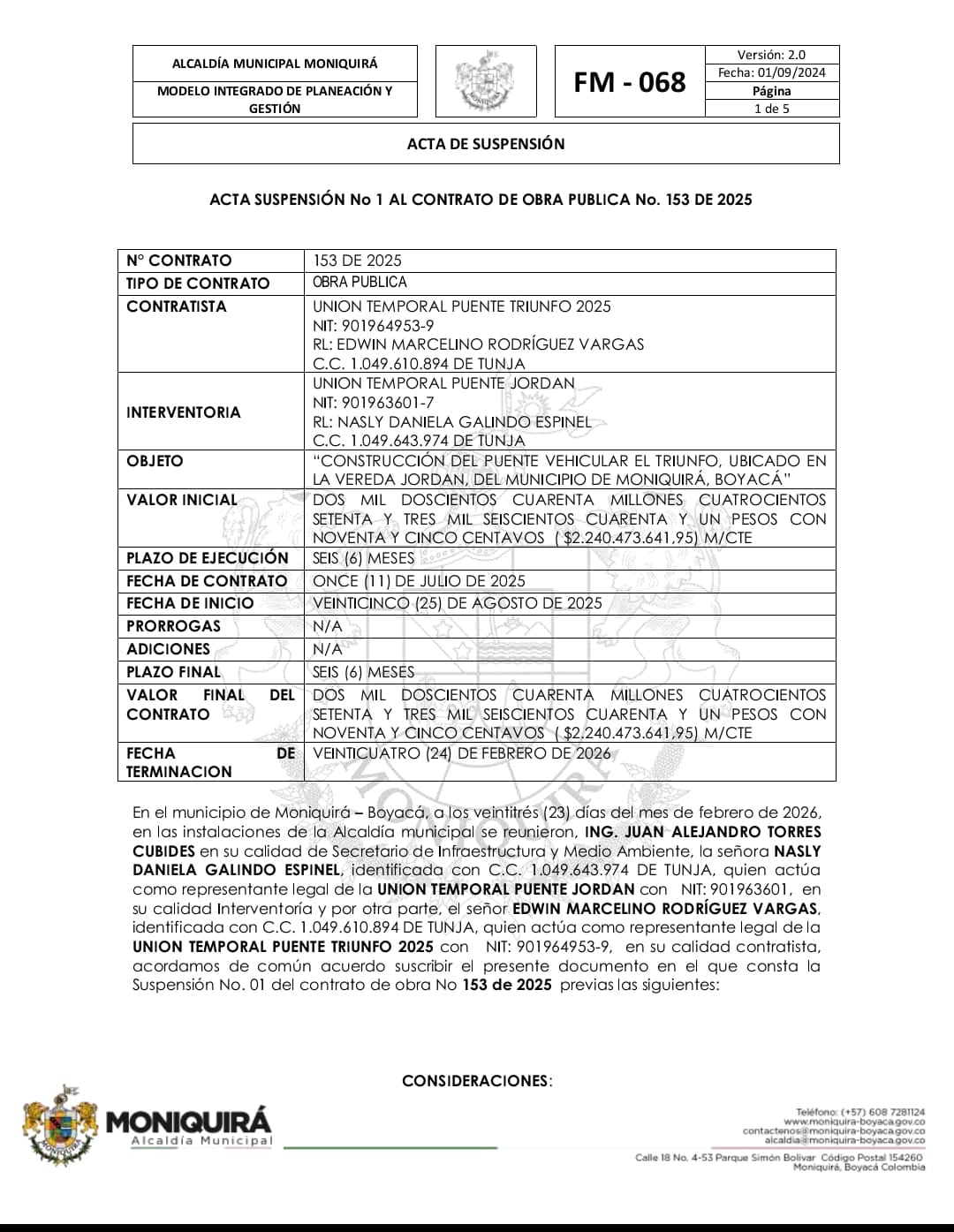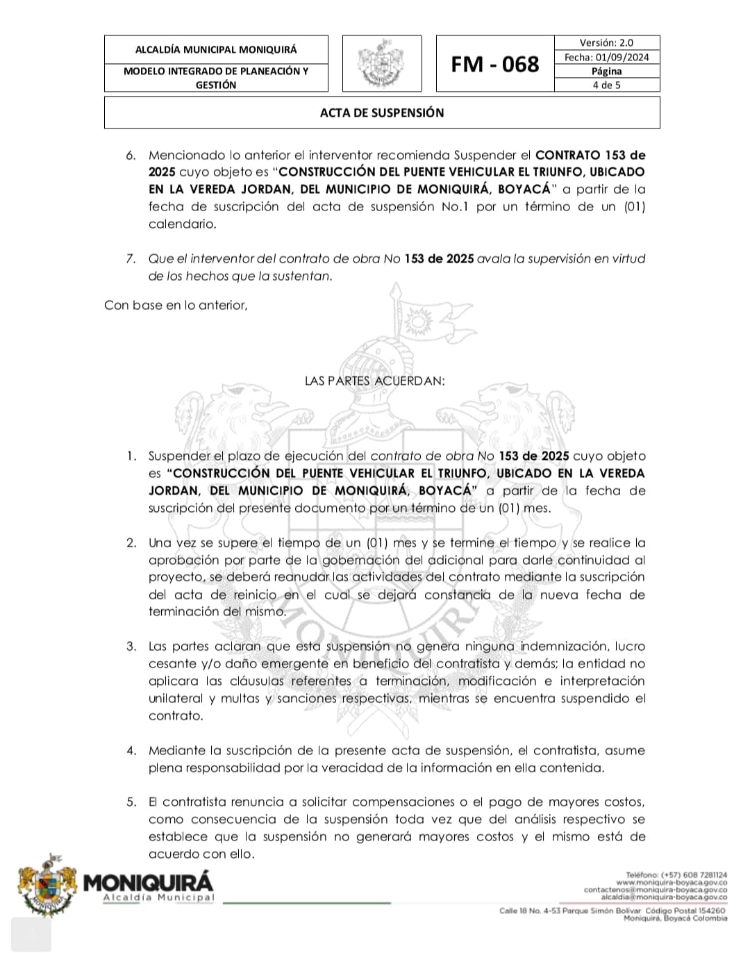 Suspender el plazo de ejecución del contrato de obra No 153 de 2025 cuyo objeto es “CONSTRUCCIÓNDEL PUENTE VEHICULAREL TRIUNFO, UBICADOEN LA VEREDAJORDAN,DEL MUNICIPIO DE MONIQUIRÁ, BOYACÁ” a partir de la fecha de suscripción del presente documento por un término de un (01) mes.