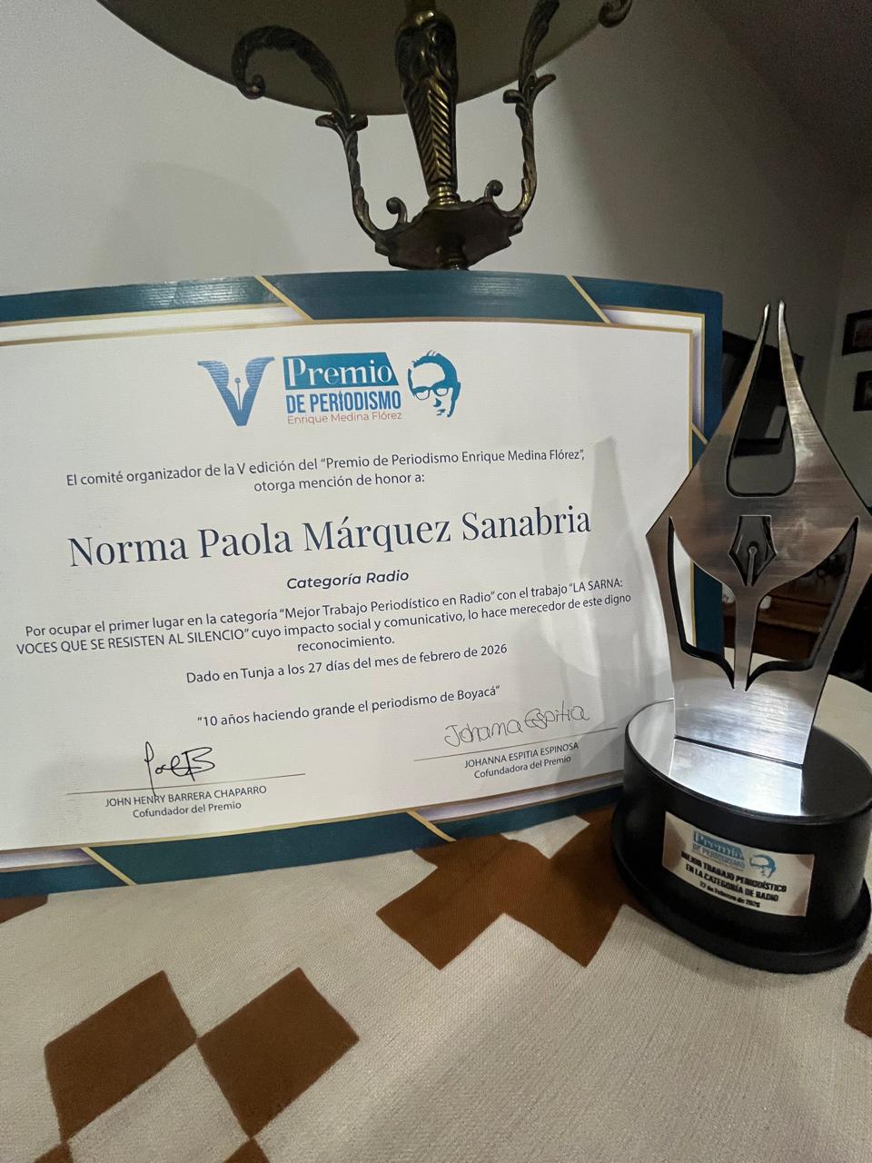 La periodista boyacense Norma Paola Márquez Sanabria fue la ganadora en la categoría Mejor Trabajo Periodístico en Radio del Premio de Periodismo Enrique Medina Flores, gracias a su trabajo titulado «La Sarna: voces que se resisten al silencio», presentado en la emisión del noticiero de 5:00 a.m. de Caracol Radio Boyacá del primero de diciembre de 2025.