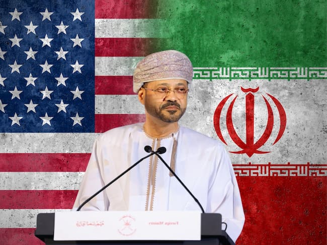 En portada: El ministro de Asuntos Exteriores de Omán, Badr bin Hamad al Busaidi. De fondo: Banderas de Estados Unidos a la izquierda e Irán a la Derecha respectivamente (Crédito: Ministerio de Relaciones Exteriores de Omán / X) (Fondo: Getty Images)