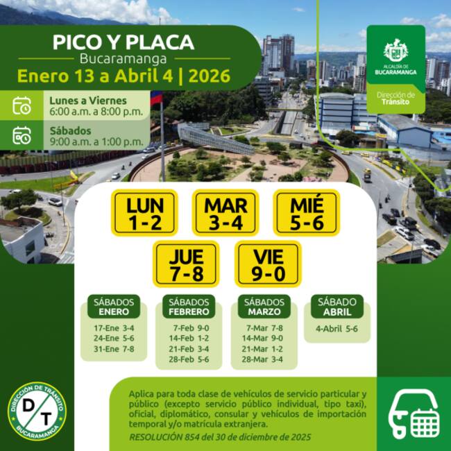 Pico y Placa para el primer trimestre de 2026 en Bucaramanga (Cortesía: Alcaldía de Bucaramanga)