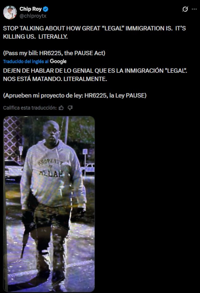 Chip Roy, republicano de la Cámara de Representantes, publicó en X una foto del atacante en la que se le ve sosteniendo un rifle y vistiendo una sudadera con la inscripción “Property of Allah (Propiedad de Alá)”.