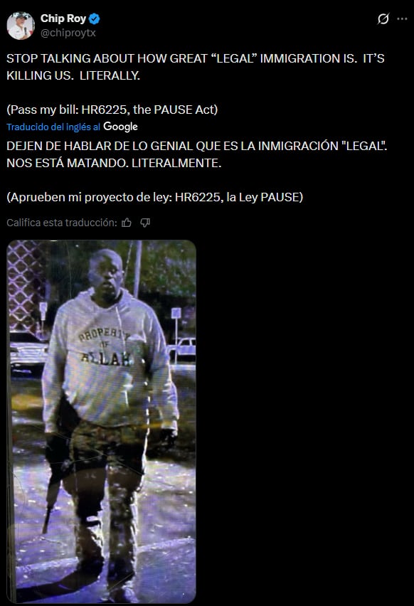 Chip Roy, republicano de la Cámara de Representantes, publicó en X una foto del atacante en la que se le ve sosteniendo un rifle y vistiendo una sudadera con la inscripción “Property of Allah (Propiedad de Alá)”.
