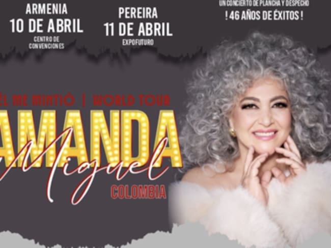 La reconocida cantautora argentina Amanda Miguel regresará a Colombia con su gira internacional “Él Me Mintió World Tour”, una puesta en escena que celebra 46 años de trayectoria y que tendrá únicamente dos presentaciones en el país: el 10 de abril en el Centro de Convenciones de Armenia y el 11 de abril en Expofuturo de Pereira.