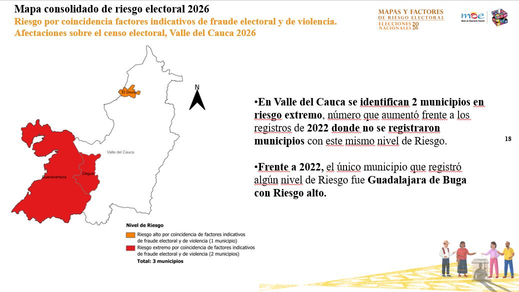 En el mapa de riesgo en el departamento figuran con mayor relevancia por fraude electoral y por violencia el Distrito de Buenaventura, Jamundí, Pradera y Florida