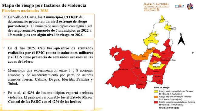 En el Valle del Cauca, los municipios que figuran con mayor nivel de riesgo son Buenaventura, Jamundí, Pradera y Florida, especialmente en zonas rurales donde históricamente se han presentado dificultades de orden público.