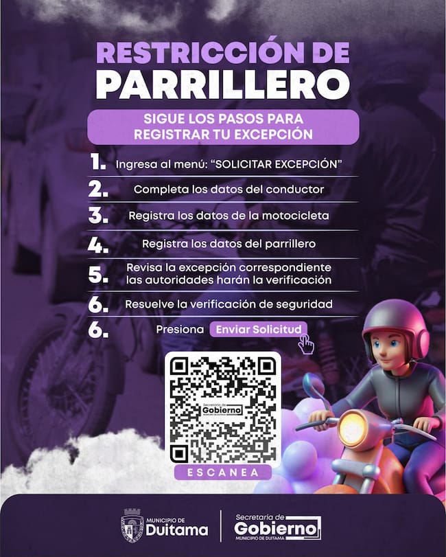 Desde el 2 de marzo rige en Duitama la restricción al parrillero hombre mayor de 14 años en motocicletas. La medida contempla excepciones registradas en plataforma oficial y sanciones económicas para quienes incumplan.