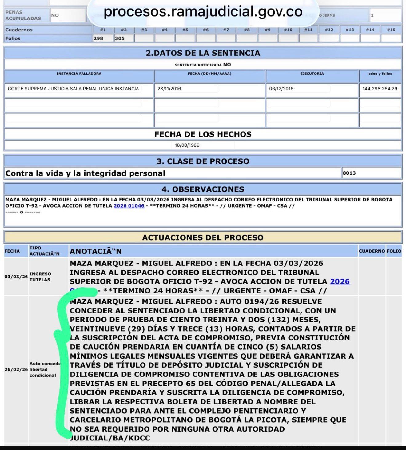 Aunque la decisión fue adoptada por el juzgado el viernes pasado aún no se ha ejecutado. El registro judicial del caso –que ustedes pueden ver a continuación– muestra que ayer en la tarde fue admitida una acción de tutela interpuesta por el general Maza.