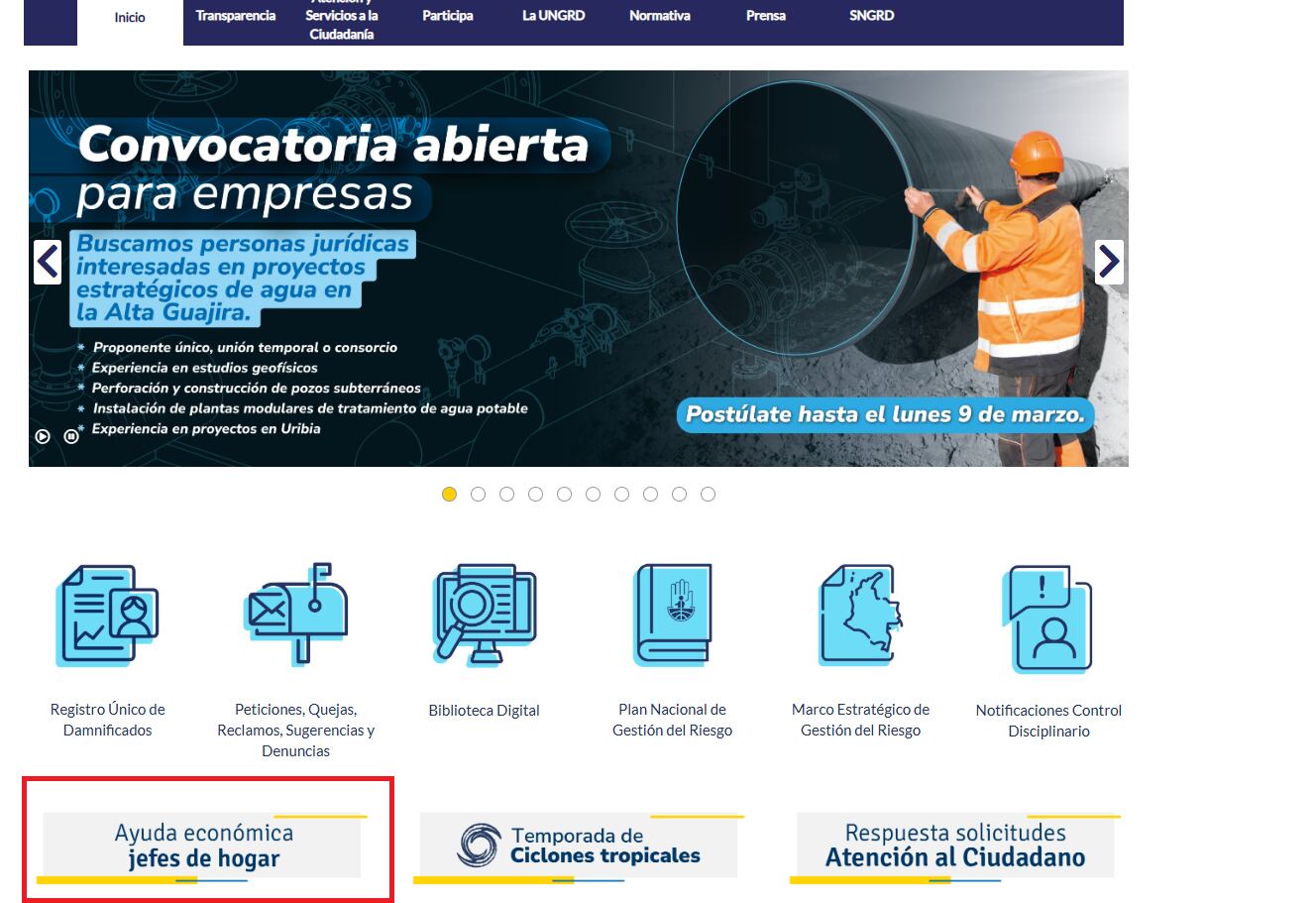 - Ingrese a la página de la UNGRD (https://portal.gestiondelriesgo.gov.co/) y haga clic en la opción ‘Ayuda económica jefes de hogar’. La opción marcada en la siguiente imagen: