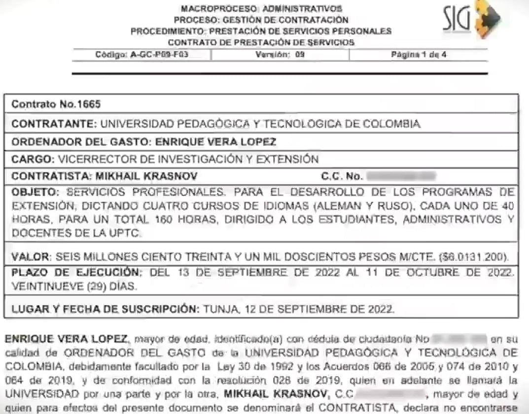 Este es el contrato que sacó a Mikhail Krasnov de la alcaldía de Tunja