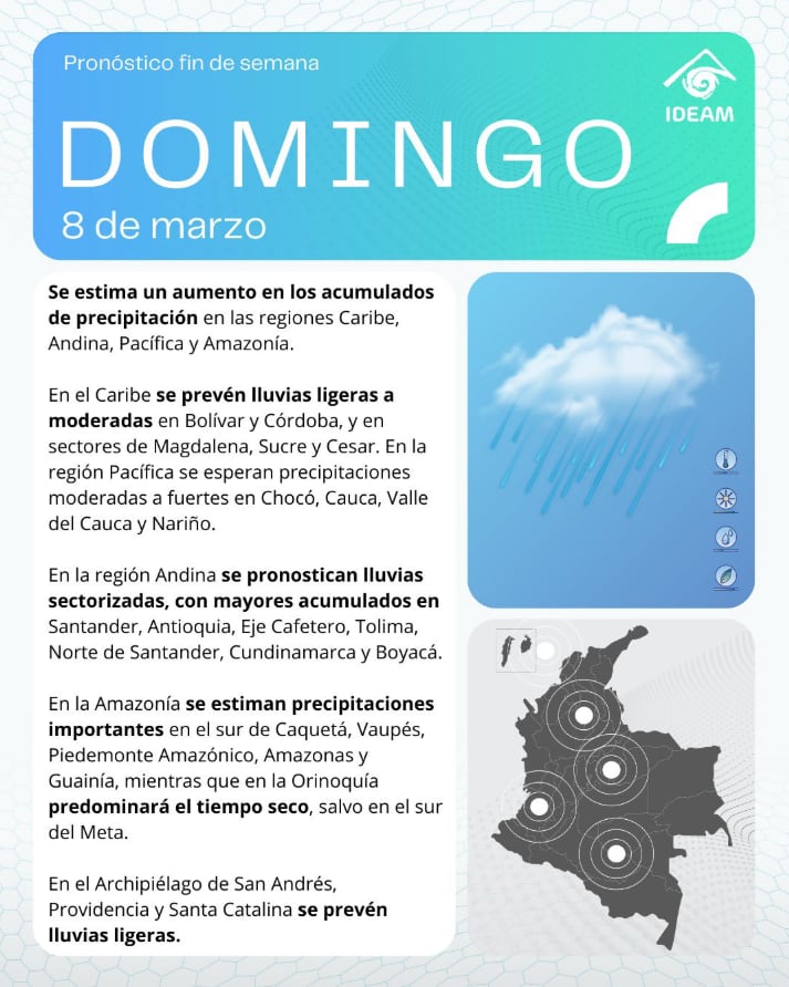 Tiempo para mañana en Colombia IDEAM: Pronóstico del clima 8 de marzo y regiones donde lloverá
