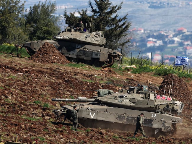 Tanques israelíes se concentran en una posición a lo largo de la frontera entre Israel y el Líbano el 8 de marzo de 2026. El Líbano se vio involucrado en la guerra de Oriente Medio el 2 de marzo, cuando el grupo militante Hezbolá, respaldado por Irán, atacó a Israel en respuesta al asesinato del líder supremo iraní, el ayatolá Alí Jamenei, durante ataques estadounidenses e israelíes. Israel, que ha mantenido sus ataques contra Hezbolá a pesar del alto el fuego de 2024, lanzó múltiples oleadas de ataques esta semana en todo el Líbano y envió tropas terrestres a las zonas fronterizas. (Photo by Jack GUEZ / AFP) / JACK GUEZ