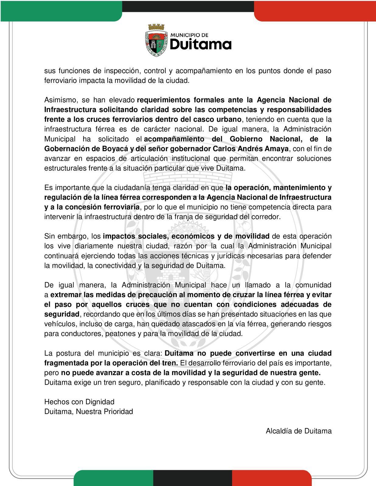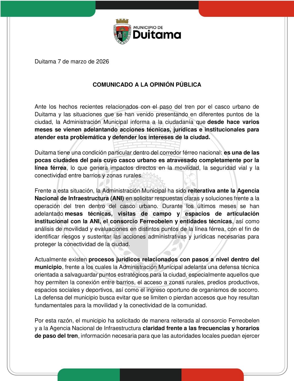 La Administración Municipal de Duitama informó que desde hace varios meses adelanta acciones técnicas, jurídicas e institucionales para atender las situaciones que se han presentado por el paso del tren en el casco urbano de la ciudad. Según explicó la alcaldia, la ciudad tiene una condición particular dentro del corredor férreo nacional, ya que es una de las pocas del país cuyo casco urbano es atravesado completamente por la línea férrea, lo que genera impactos directos en la movilidad, la seguridad vial y la conectividad entre barrios y zonas rurales.