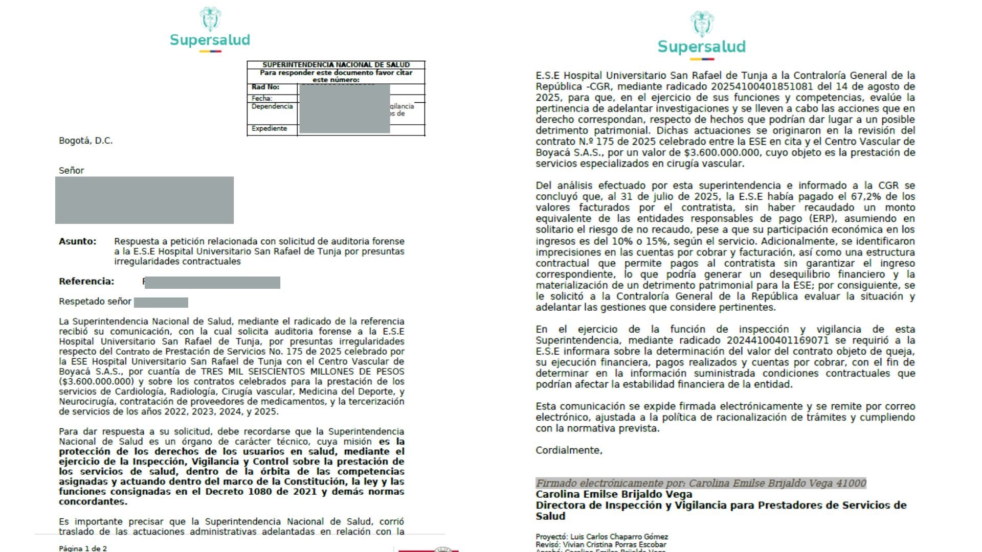 La Superintendencia Nacional de Salud trasladó a la Contraloría General de la República un análisis sobre el contrato por $3.600 millones firmado entre la E.S.E Hospital Universitario San Rafael de Tunja y Centro Vascular de Boyacá S.A.S., tras advertir pagos al contratista sin recaudo equivalente y posibles riesgos para los recursos públicos.