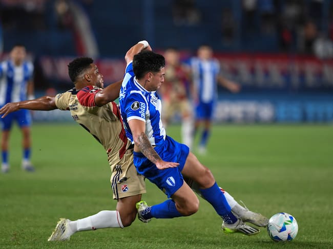 MONTEVIDEO, URUGUAY - MARCH 05: Frank Fabra of Independiente fights for the ball with Gonzalo Gomez of Juventud during a Copa CONMEBOL Libertadores 2026 match between Club Atlético Juventud de Las Piedras and Independiente Medellin at Gran Parque Central on March 05, 2026 in Montevideo, Uruguay. (Photo by Agencia Gamba/Getty Images) / Agencia Gamba