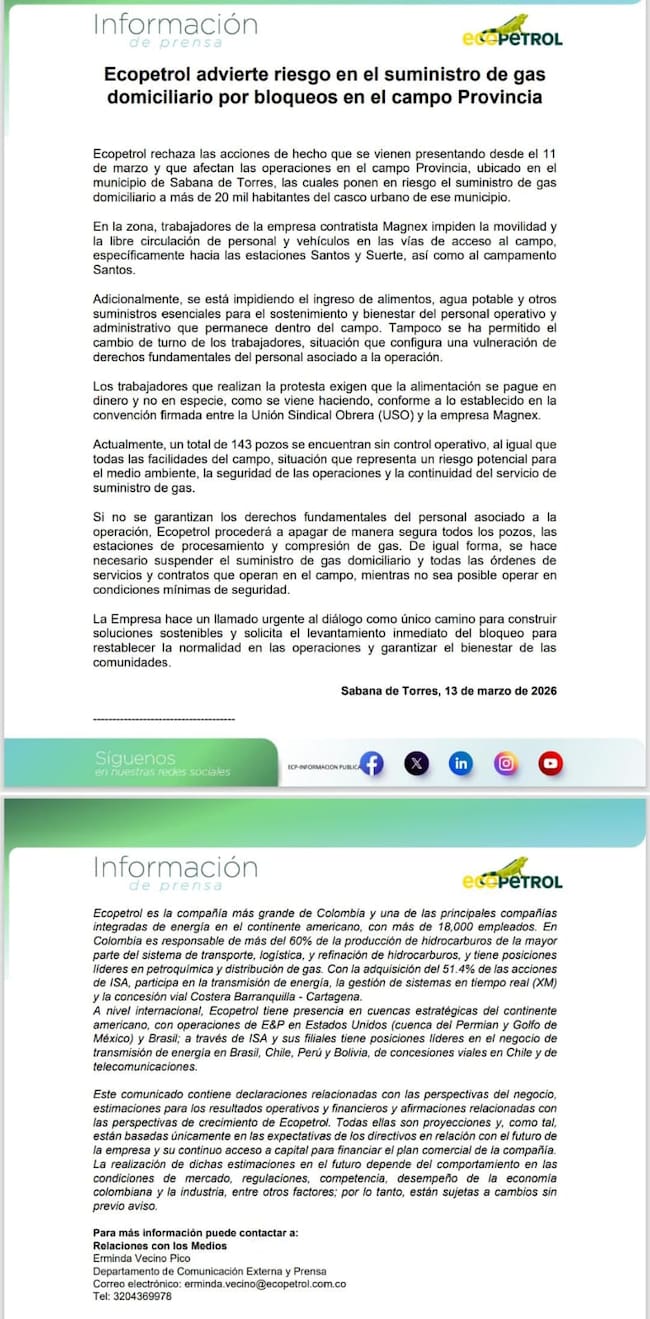 A través de un comunicado Ecopetrol anunció riesgo en la suspensión del servicio de gas domiciliario a más de 20 mil habitantes en el casco urbano de Sabana de Torres por cuenta de protestas que se vienen presentando en campo Provincia por parte de contratistas de la empresa Magnex.