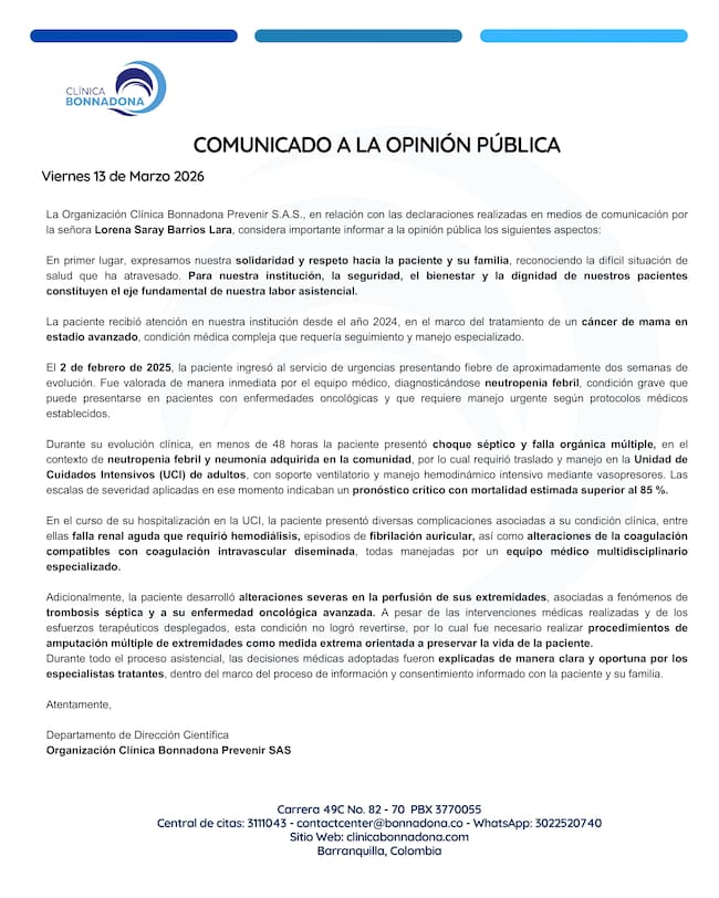 Frente a las declaraciones de la paciente, la Organización Clínica Bonnadona Prevenir S.A.S. emitió un comunicado en el que expresó solidaridad con Barrios y su familia, y aseguró que la paciente fue atendida desde 2024 en el marco del tratamiento de un cáncer de mama en estado avanzado, condición que calificó como compleja y que requería manejo especializado.
