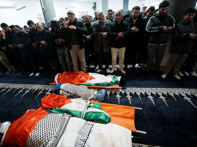 Funeral de la familia palestina que fue asesinada por fuerzas israelíes. La familia estaba conformada por Ali Khalid Sayil Beni Awda (37 años), su esposa Vaad Osman Akil Beni Awda (35 años) y sus hijos Mohammed (5 años) y Osman (7 años). (Foto: Issam Rimawi/Anadolu via Getty Images) / Anadolu