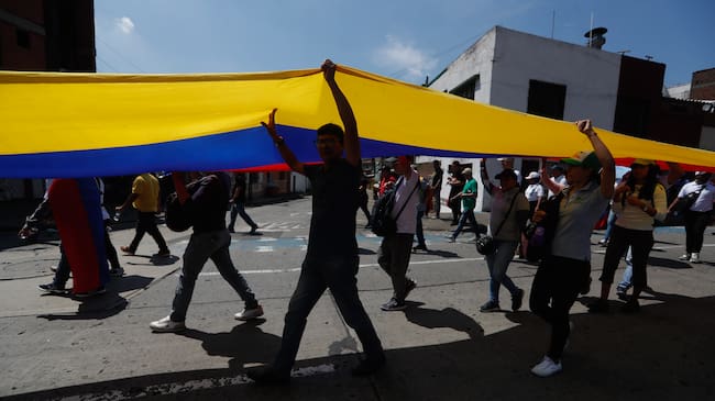 Ciudadanos colombianos cargando la bandera del país. Foto: EFE. / Ernesto Guzmán (EFE)